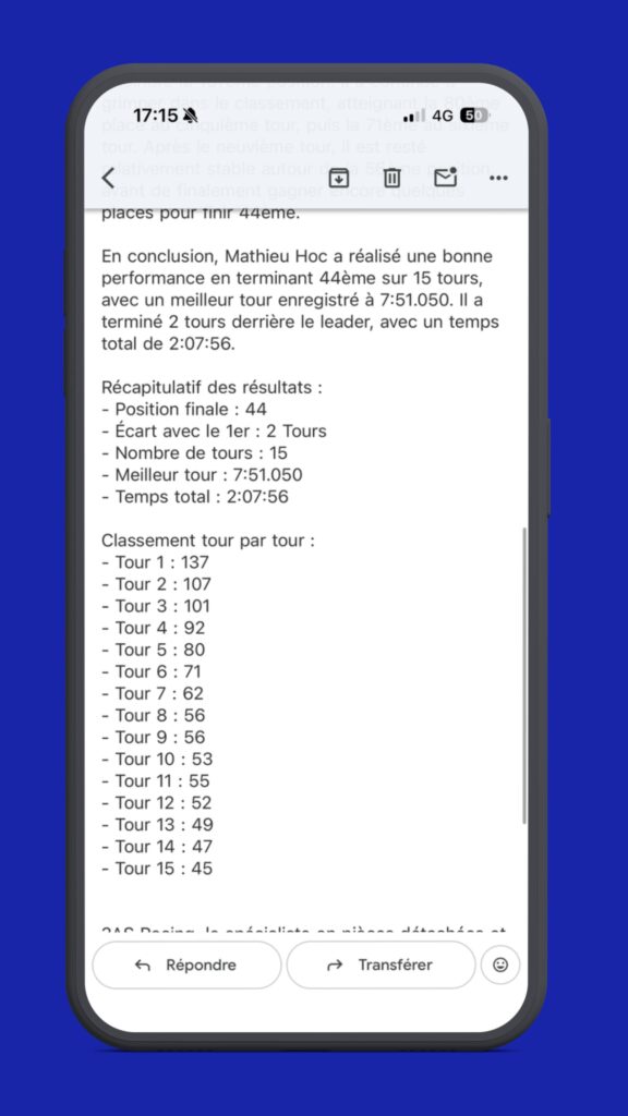 Recevez un email personnalisé avec votre classement final, votre position tour par tour, ainsi qu’un résumé de votre course !
