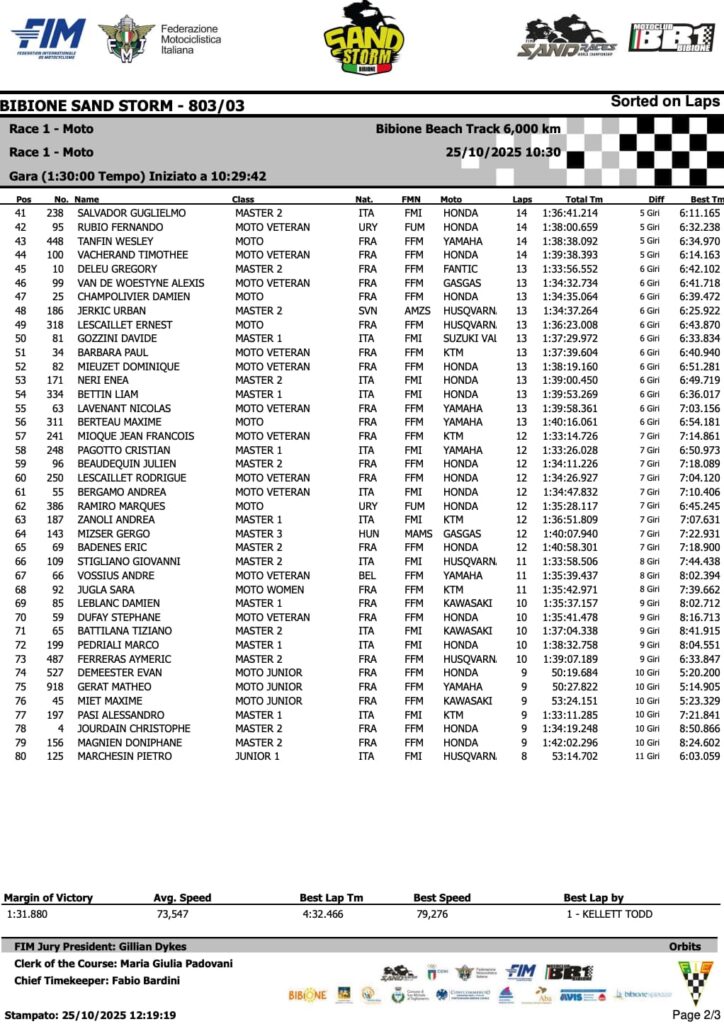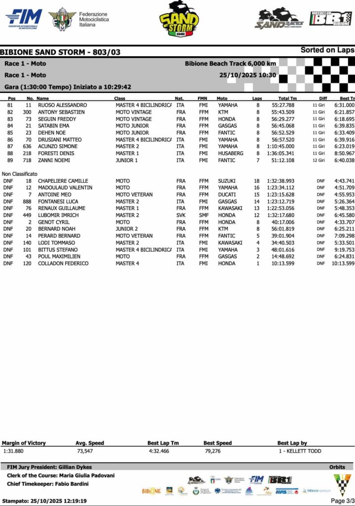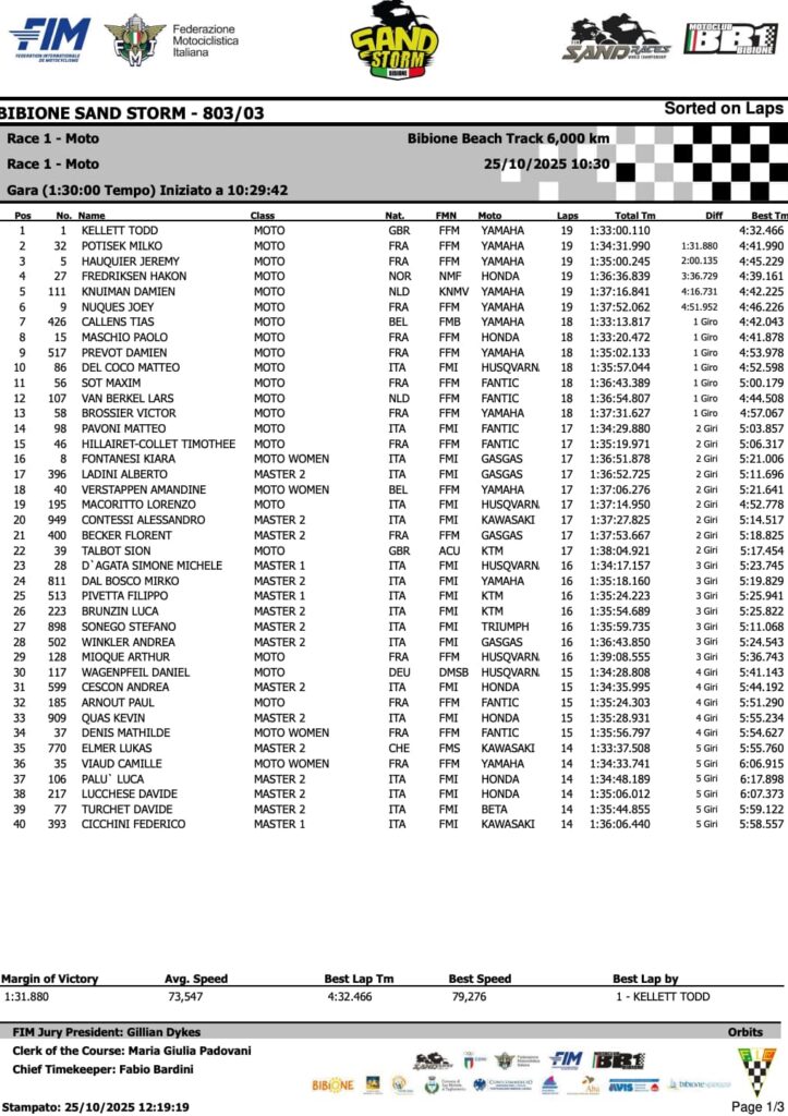 Découvrez les résultats de la Bibione Stand Storm en Italie, 3e épreuve du Championnat du Monde des courses sur sable FIM.