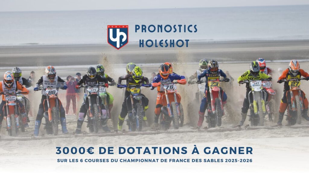 Le Championnat de France des Sables, c’est 6 courses de motocross sur sable et donc 6 départs. Tout au long du CFS 2025-2026, Pilote de Sable et Up Design vous proposent de faire vos propres pronostics sur le pilote qui réalisera le « holeshot » à chaque épreuve !