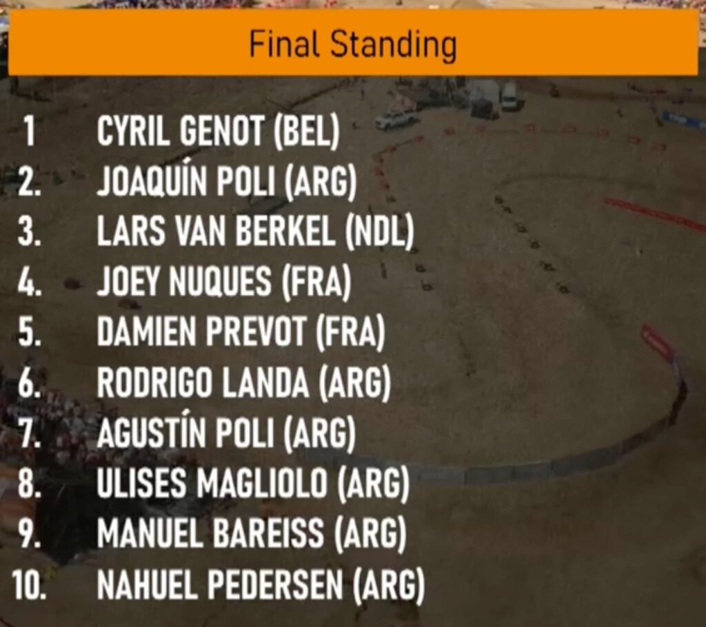 Solide jusqu’au drapeau à damier, Cyril Genot s’impose pour la première fois en Argentine. Il devance le tenant du titre Joaquin Poli, tandis que Lars van Berkel complète le podium. Joey Nuques et Damien Prévot complètent le top 5.